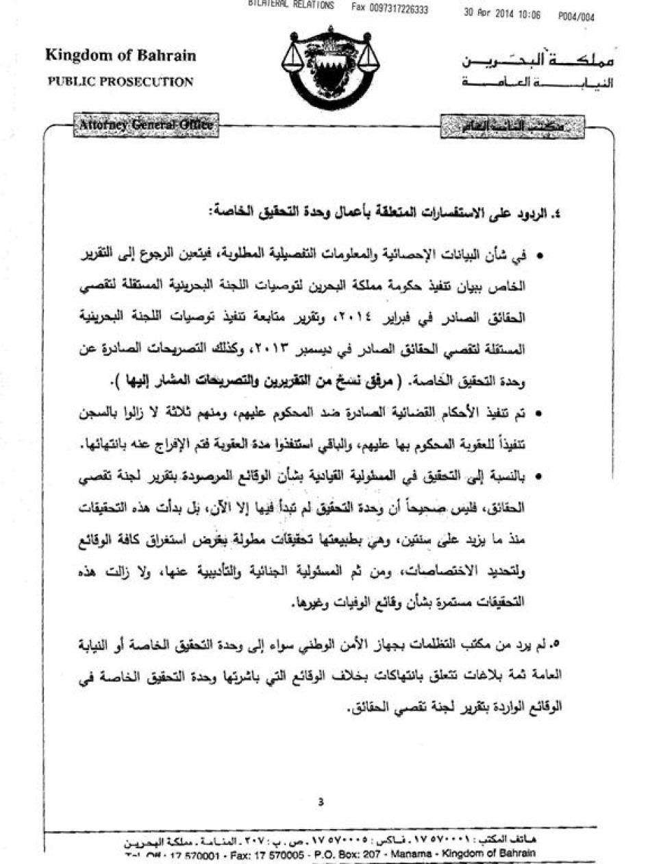 [105] الخارجية الأمريكية، "تقرير حقوق الإنسان 2013: البحرين"، 2013: http://www.state.gov/j/drl/rls/hrrpt/humanrightsreport/index.htm?year=2013&dlid=220348#wrapper ص ص 2 و4 (تمت الزيارة في 29 أبريل/نيسان 2014). (أشار إلى أن المسؤولين الأمريكيين لم يتمكنوا من التأكد من مزاعم الحكومة البحرينية بأن أفراد الأمن المدانين محتجزين في السجن). رد مكتب النائب العام على هيومن رايتس ووتش ورد فيه أن أفراد الأمن الثلاثة المُدانين هم في السجن وأن عدداً آخر غير محدد "استنفدوا مدة العقوبة فتم الإفراج بانتهائها". لم يذكر الخطاب أي أفراد أمن بالاسم يُزعم أنهم كانوا محتجزين أو محتجزين حالياً.
