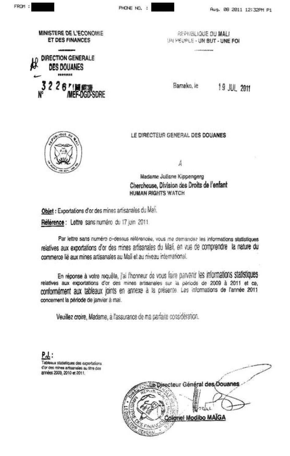[386] Entretien de Human Rights Watch avec un responsable gouvernemental, Ministère des Mines, Bamako, 30 mars 2011 ; entretien de Human Rights Watch avec un fonctionnaire de la Direction Nationale des Mines, 15 février 2011.