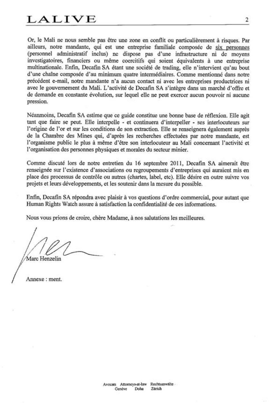 [371] Lettre de Marc Henzelin, Lalive, à Human Rights Watch, 10 août 2011. Voir la lettre de Human Rights Watch et la réponse complète en Annexe III.