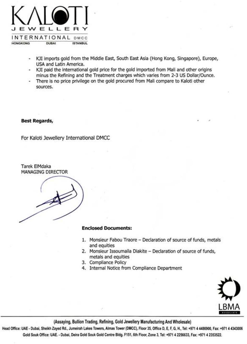[377] Lettre de Tarek El-Mdaka, directeur général, Kaloti Jewellery International DMCC, à Human Rights Watch, 30 juillet 2011.
