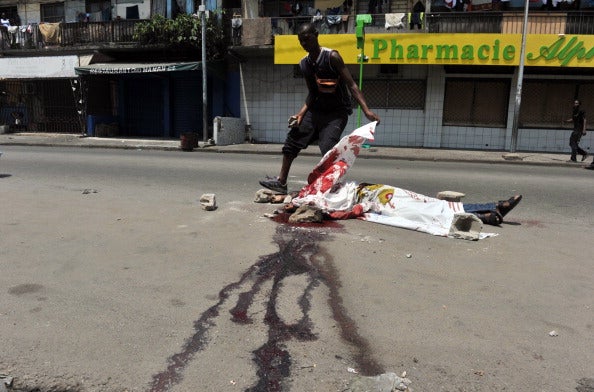 A man shows the body of a civilian who was killed on February 21, 2011 in the neighborhood of Treichville in Abidjan, in clashes between forces loyal to Laurent Gbagbo and supporters of Alassane Ouattara.