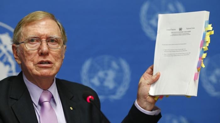 Michael Kirby, Chairperson of the Commission of Inquiry on Human Rights in North Korea holds a copy of his report during a news conference at the United Nations in Geneva on February 17, 2014.