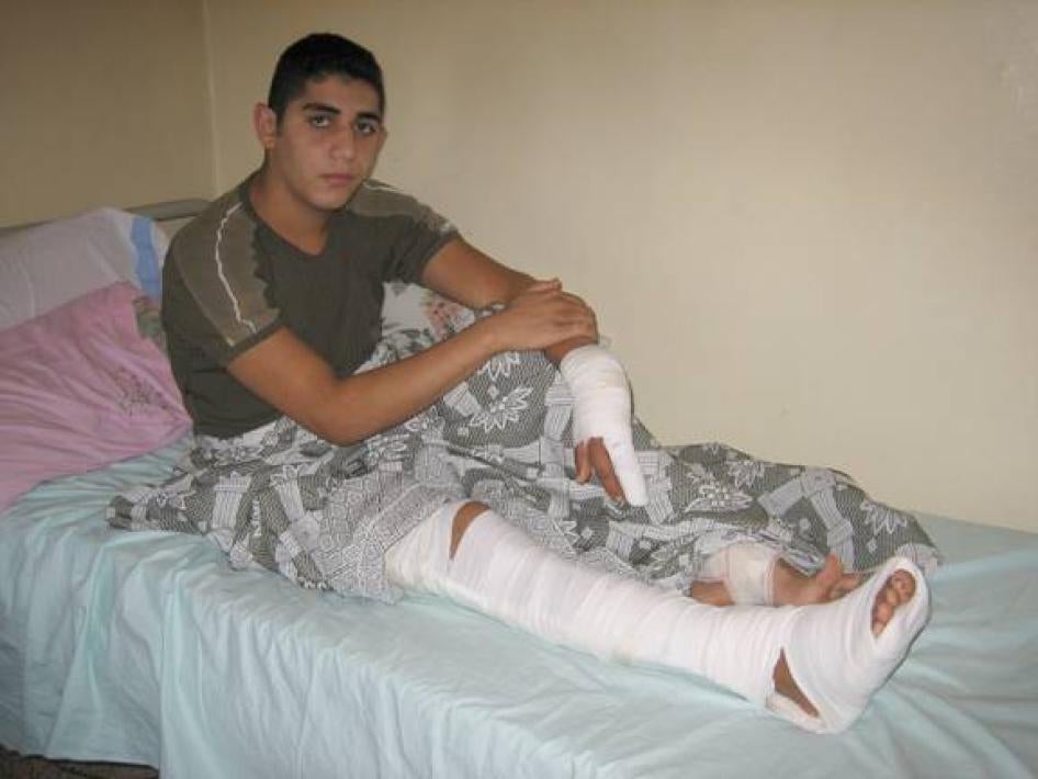 A submunition seriously injured Muhammad Abdullah Mahdi, an 18-year-old mechanic, when he tried to move a car motor at his garage in Zawtar al-Sharkiyeh on October 4, 2006. Shown here about three weeks later, he hemorrhaged, lost half of his left hand, was injured in his right leg, and suffered psychological trauma. © 2006 Bonnie Docherty/Human Rights Watch