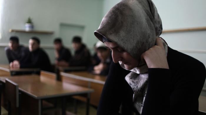 A female student covers herself with a headscarf in a high school in Grozny, the capital of Chechnya. Headscarves are mandatory for female students in Chechnya today. © 2011 Diana Markosian