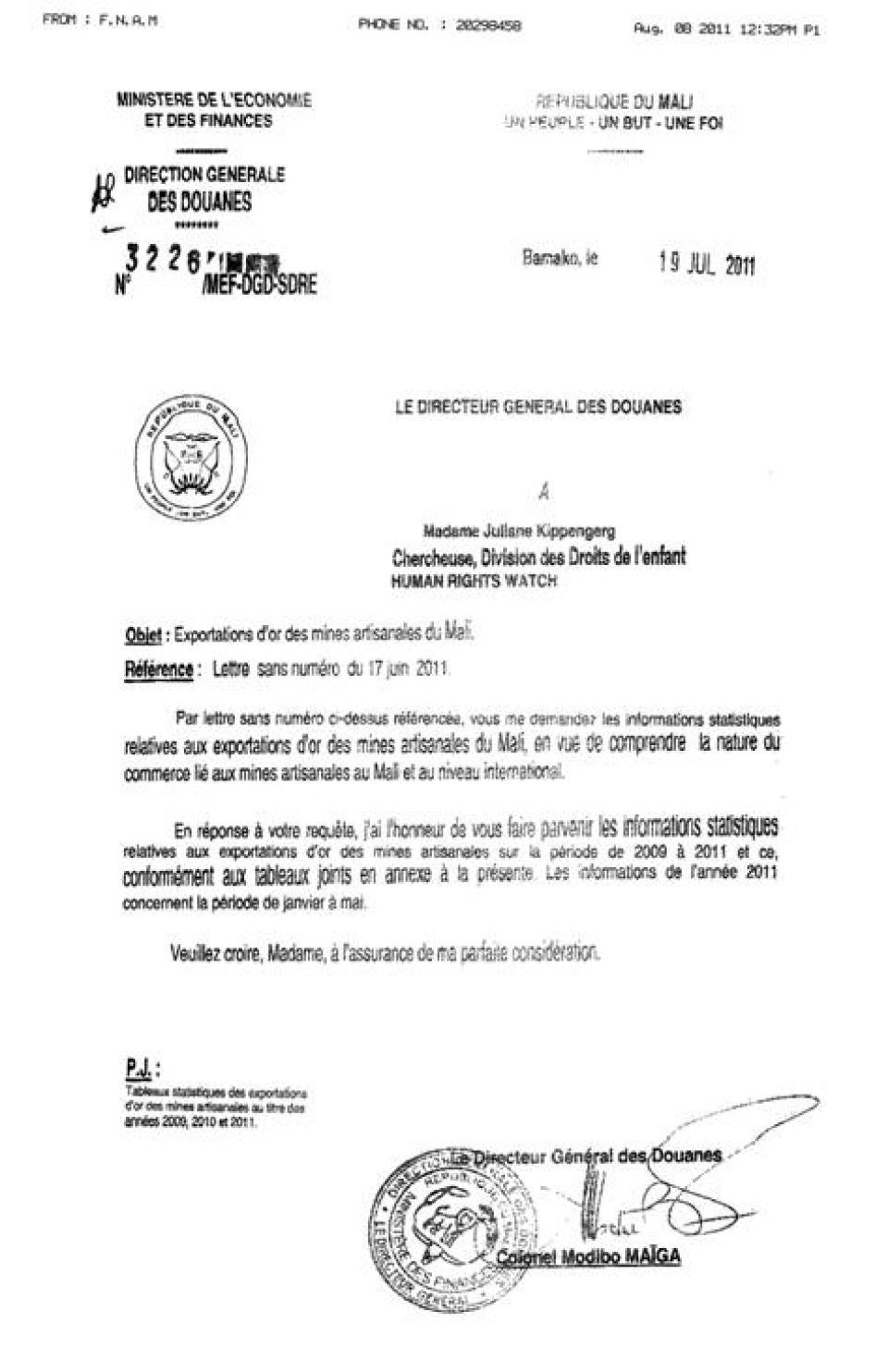 [367] See Annex I, Ministère de l’Economie et des Finances, “Tableaux statistiques des exportations d’or des mines artisanales au titre des années 2009, 2010 et 2011,” Bamako, July 19, 2011.