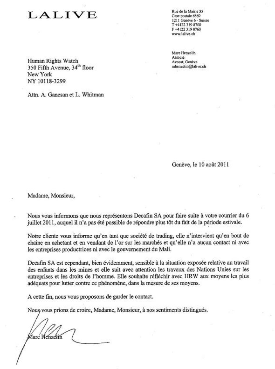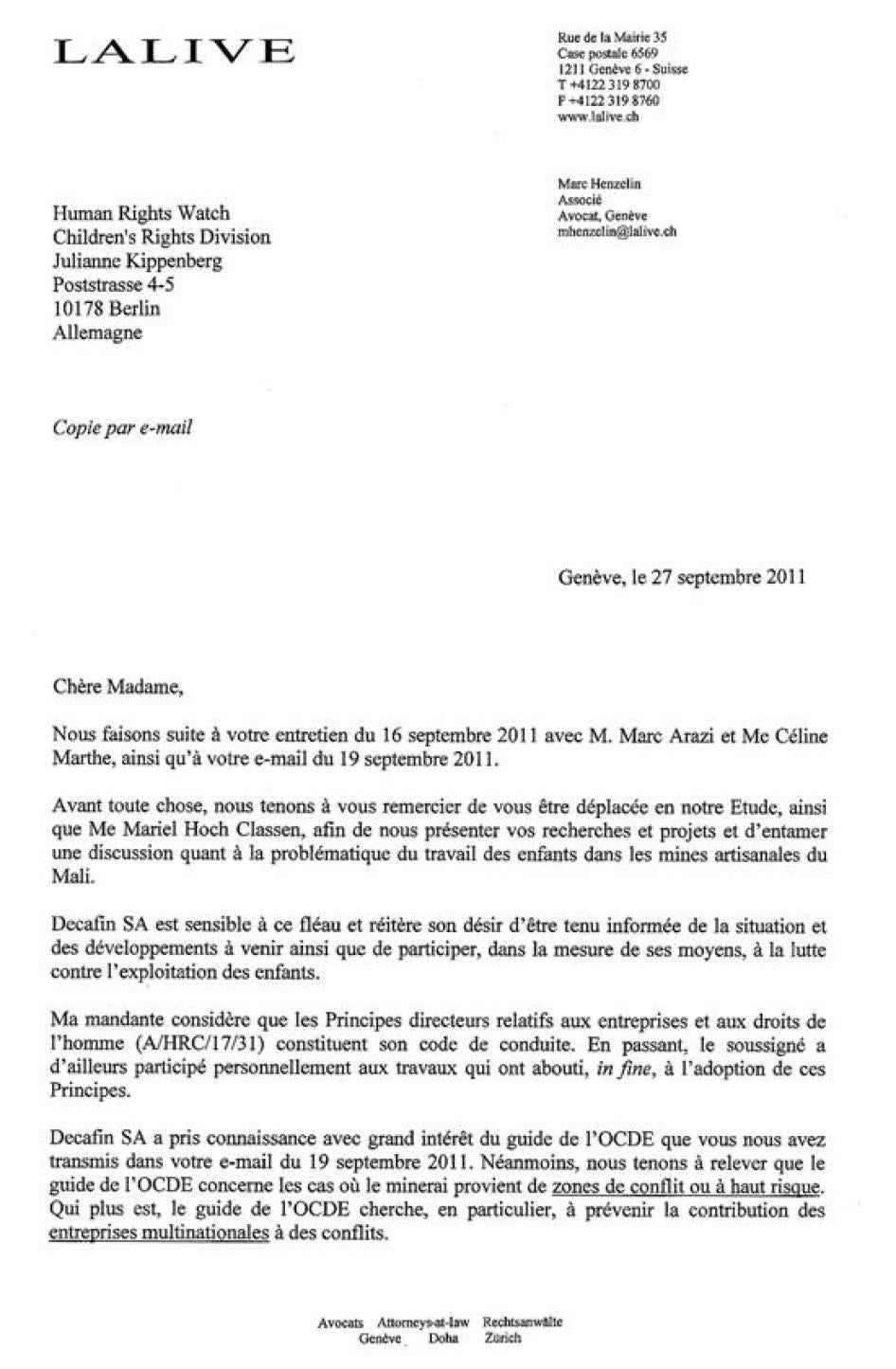 [371] Letter from Marc Henzelin, Lalive, to Human Rights Watch, August 10, 2011 (translated by Human Rights Watch). See the Human Rights Watch letter and the full response in Annex III.