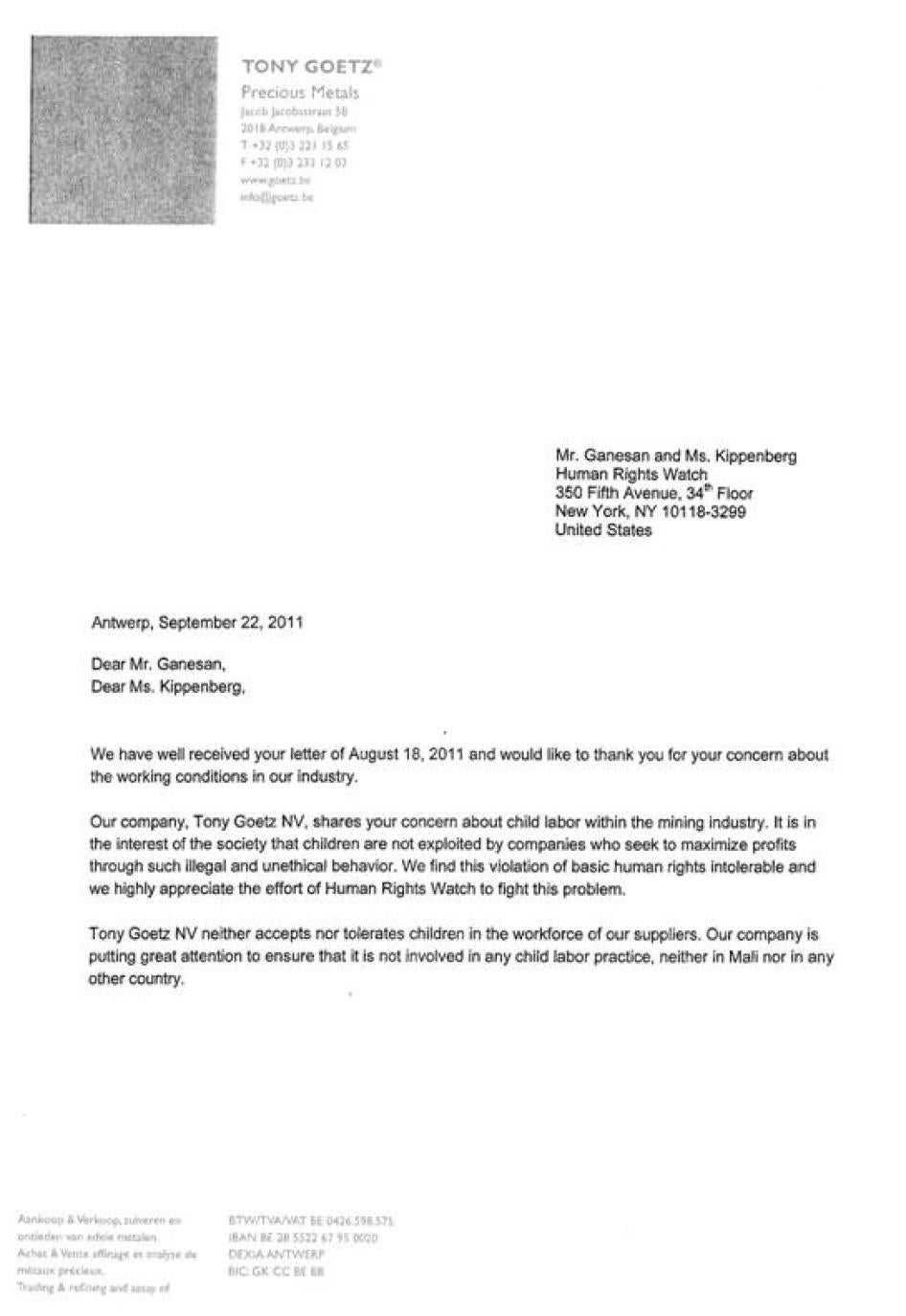 [375] See Annex IV, Letter from Tareq El-Mdaka, Managing Director, Kaloti Jewellery International DMCC, to Human Rights Watch, July 30, 2011.