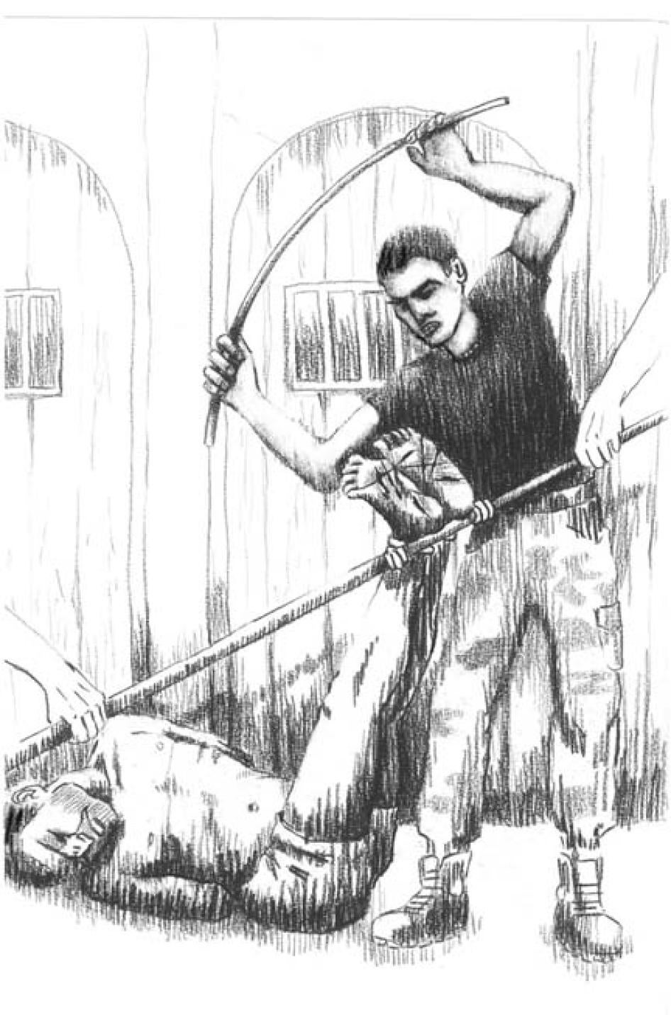 The mildest form of torture is hitting people with batons on their arms and legs and not giving them anything to eat or drink. Then they would hang the detainees from the ceiling by their hands, sometimes for hours or days. I saw it while I was talking to the interrogators. They used electric stun-guns and an electroshock machine, an electric current transformer. It is a small machine with two wires with clips that they attach to nipples and a knob that regulates the current. In addition, they put people in coffins and threatened to kill them and close the coffin. People were wearing underwear. They pour hot water on people and then whip them. I’ve also seen drills there, but I’ve never seen them being used. I’ve also seen them using martial art moves, like breaking ribs with a knee kick. They put pins under your feet and hit you so that you step on them. I also heard them threatening to cut off the detainees’ penises.