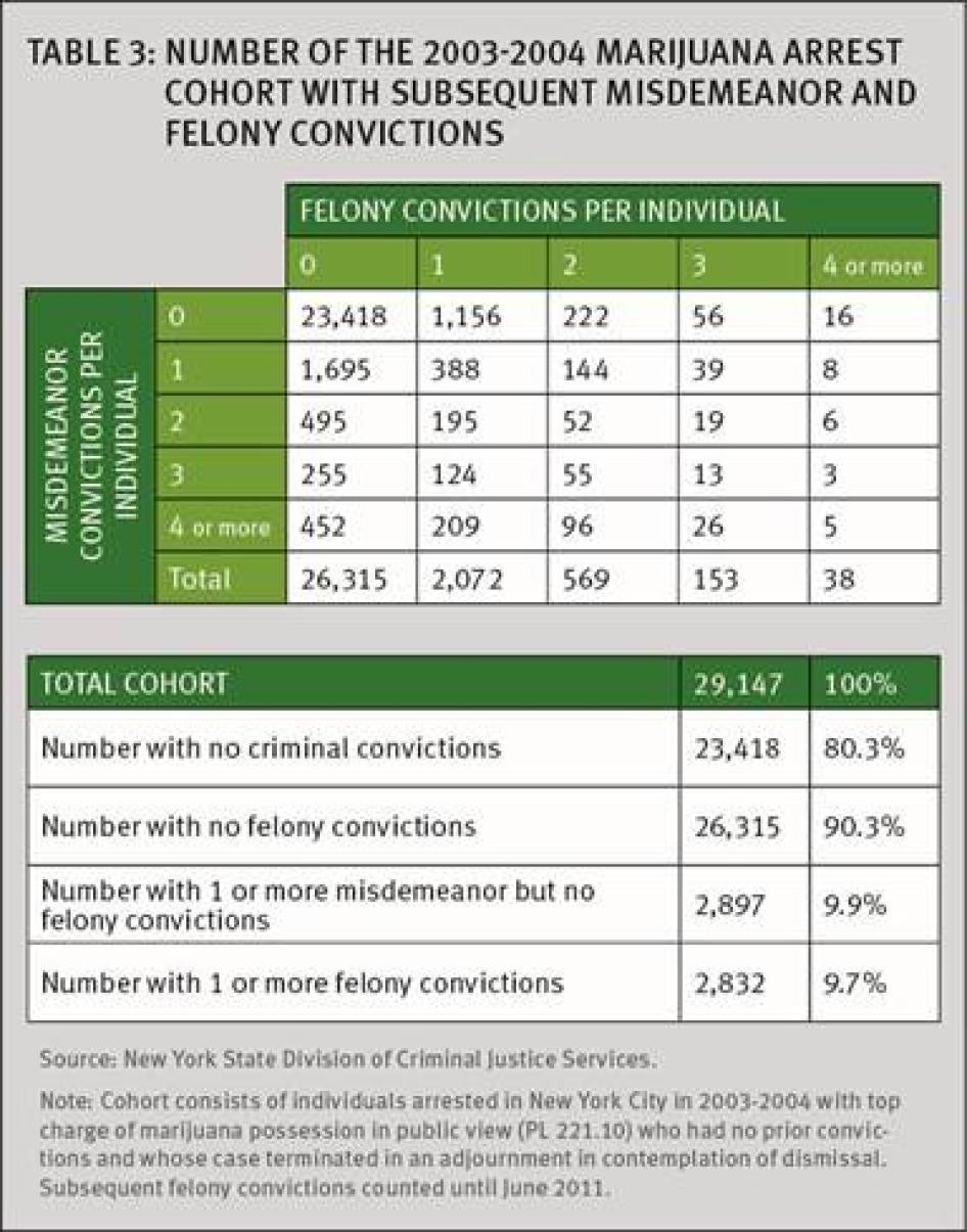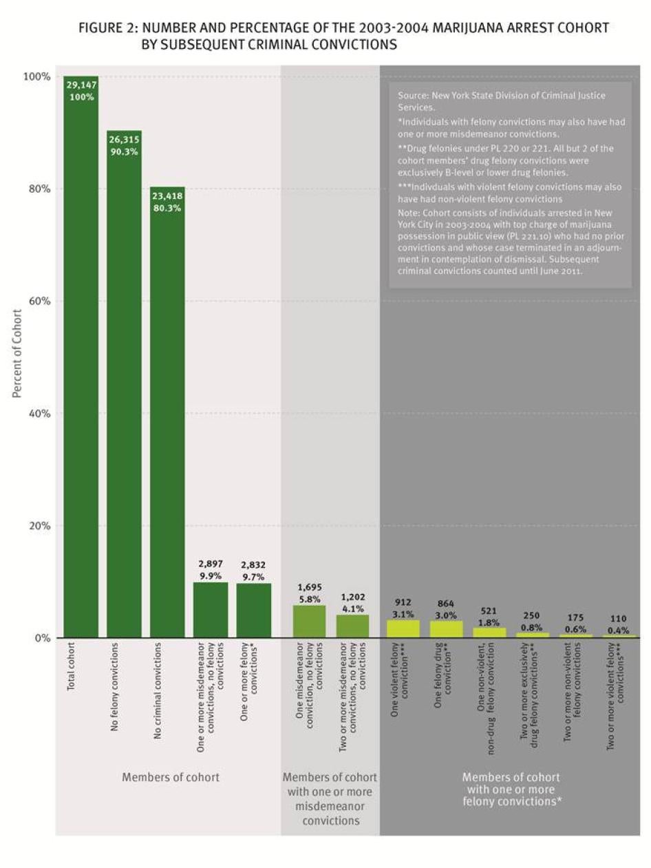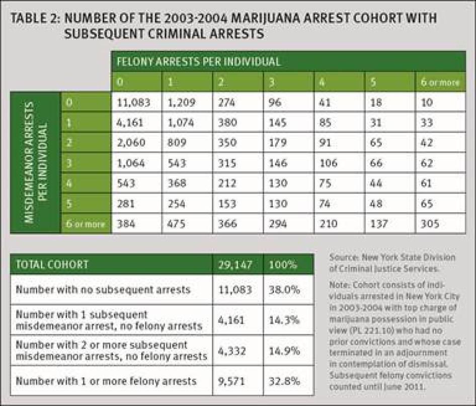 Information about marijuana arrestees would be useful to the police to solve past or future crimes if the arrestees had engaged or subsequently did engage in such crimes. Levine has previously shown that the preponderance of arrestees for marijuana possession in New York City do not have criminal records.[53] Human Rights Watch has supplemented this research by developing data that indicates people whose initial contact with the criminal justice system is for marijuana possession in public view rarely become dangerous felons in the future.