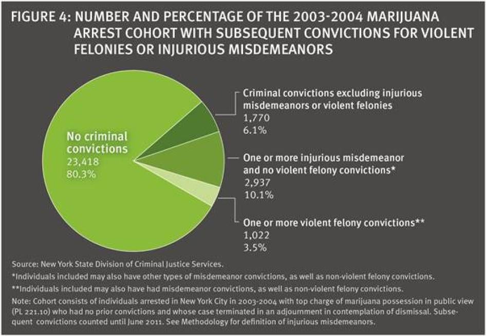 [12] DCJS provided the criminal history data to Issa Kohler-Hausmann for an ongoing research project on New York City misdemeanors; Ms. Kohler-Hausmann worked as a Human Rights Watch consultant for this project to track the subsequent criminal trajectories of marijuana arrestees. The data was provided by DCJS in the interest of information exchange. The opinions, findings, and conclusions expressed in this publication are those of the authors and not those of DCJS. Neither New York State nor DCJS assumes liability for its contents or use thereof. The data was in the form of micro-level arrest incidents grouped by de-identified identification number. DCJS was not involved in the analysis of the data and bears no responsibility for our methods of statistical analysis or for the conclusions derived therefrom.