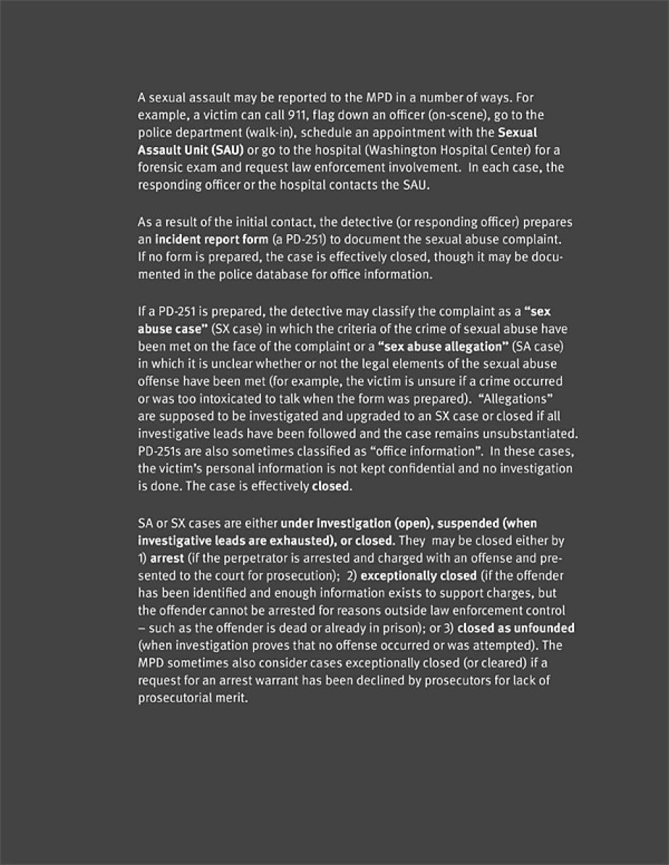 From 2008 through September of 2011, MPD officers used a variety of mechanisms to effectively shut down investigations—often before they even got started—of cases they did not deem credible. Human Rights Watch’s review of data, agency documents, and police investigative files corroborates the impressions of many victims, community advocates, and witnesses who told us that the MPD often closed cases without meaningful investigation.