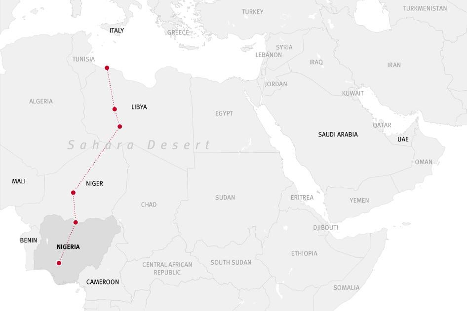 Most women and girls interviewed by Human Rights Watch said they were trafficked by people they know, who prey on their desperation, making false promises of paid employment, professional training, and education. They are transported within and across national borders, often under life-threatening conditions. Survivors recounted harrowing journeys as traffickers forced them through the Sahara Desert to destinations in Libya, or in some cases, Europe via the Mediterranean Sea. Their journeys were wrought with death, rape, beatings, fear, theft, extortion, and lack of food and water. The danger of these journeys was captured by one 28-year-old woman who said, “You pray for death. You cry until you cannot cry any more. People die, faint, are beaten, raped. I would not advise even my worst enemy to travel by land.”