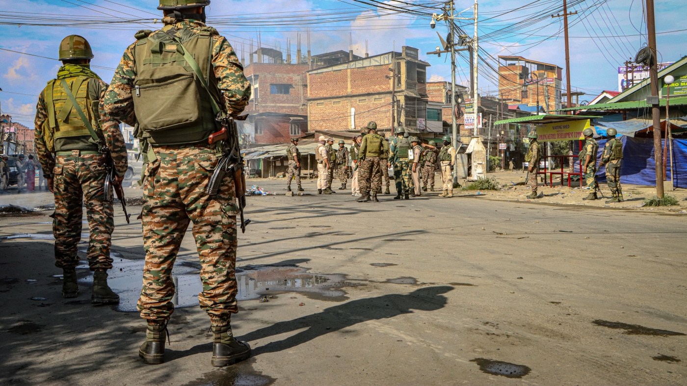 Security personnel stand guard during a curfew imposed after protesters clashed with security forces in Imphal, Manipur, India, on June 9, 2025.