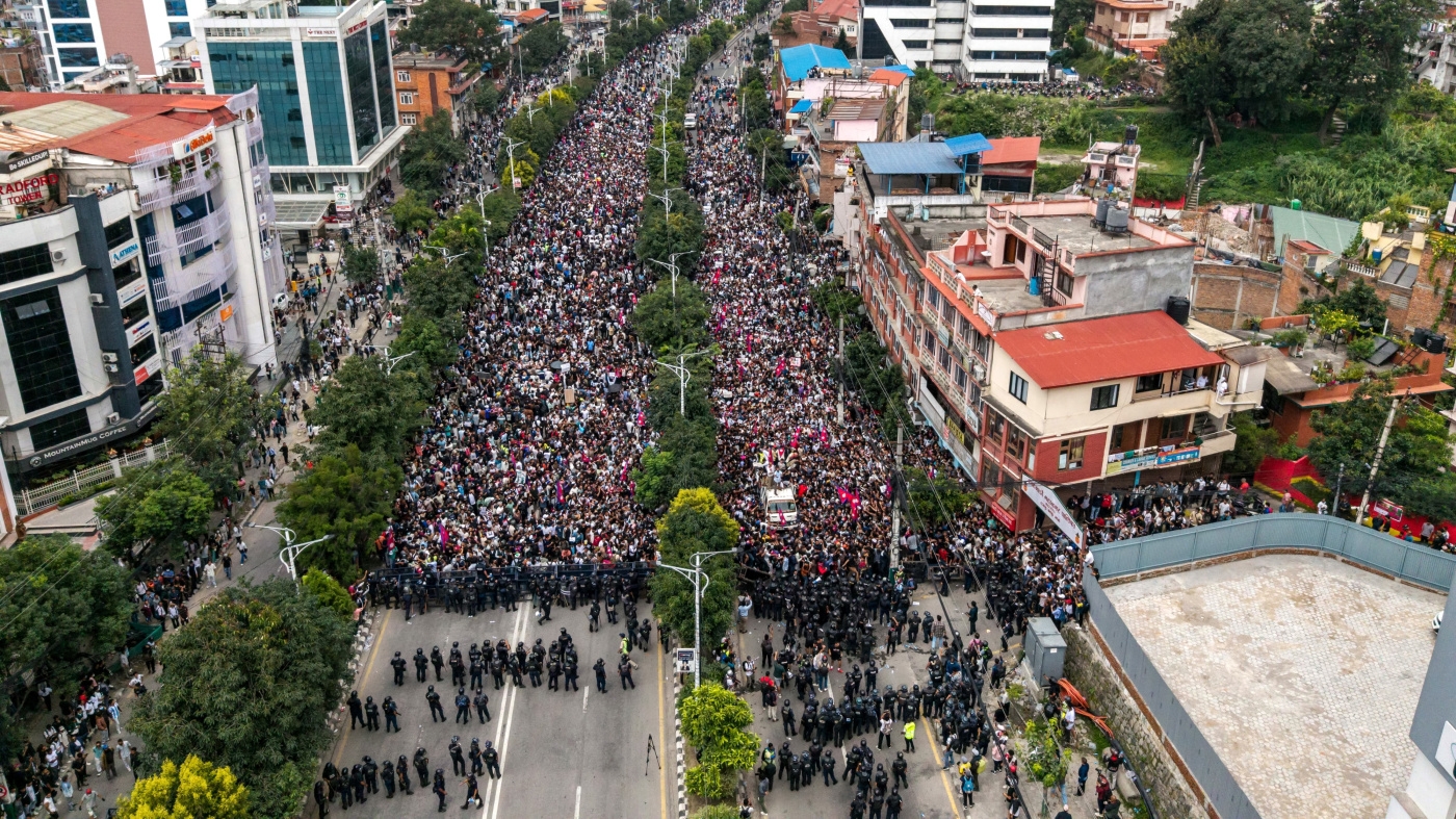 Demonstrators outside Nepal's Parliament during a protest in Kathmandu condemning social media prohibitions and corruption by the government, September 8, 2025.