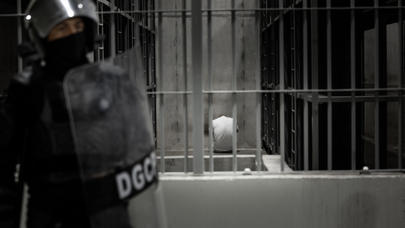 A Venezuelan migrant sits inside a cell at CECOT prison in Tecoluca, El Salvador, March 16, 2025.
