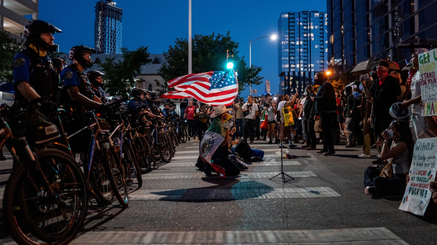 People gather facing law enforcement after marching through downtown Austin, Texas at the conclusion of the "No Kings Day" demonstration in the US, June 14, 2025.